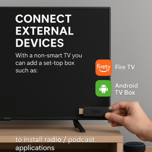 - With a non-smart TV you can add a set-top box such as Fire TV Stick, or Android TV Box to install radio / podcast applications.