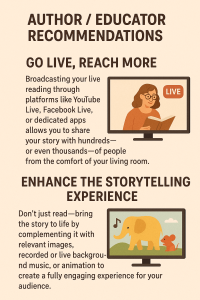 Broadcasting your live reading using YouTube Live , Facebook Live, or Zoom can allow you to read to hundreds of people from your living room!